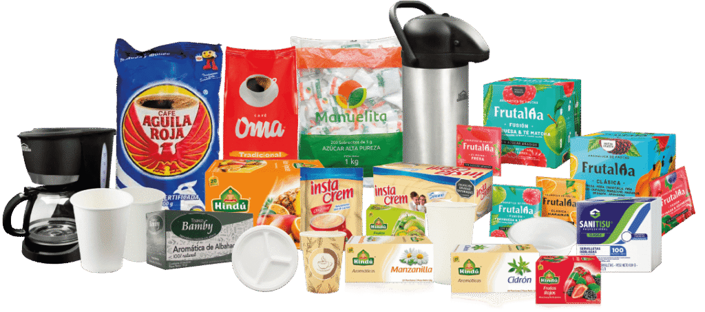 Productos indispensables para zonas de descanso, reuniones o espacios de hospitalidad corporativa. Incluye café de diferentes tipos, aromáticas, azúcar, vasos, platos, servilletas y mezcladores.
